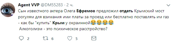 Пользователи Сети негативно отреагировали на высказывание российского актера Михаила Ефремова о том, что разрешить вопрос с Крымом можно двумя способами: откупиться от Украины бесплатными поставками газа на протяжении 10—15 лет или передать мост украинцам для взимания платы за проезд.