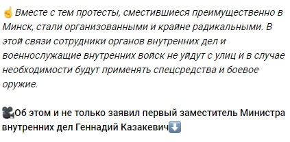 По его словам, в связи с тем, что протесты стали организованными и крайне радикальными, сотрудники органов внутренних дел и военнослужащие внутренних войск в случае необходимости будут применять спецсредства и боевое оружие.