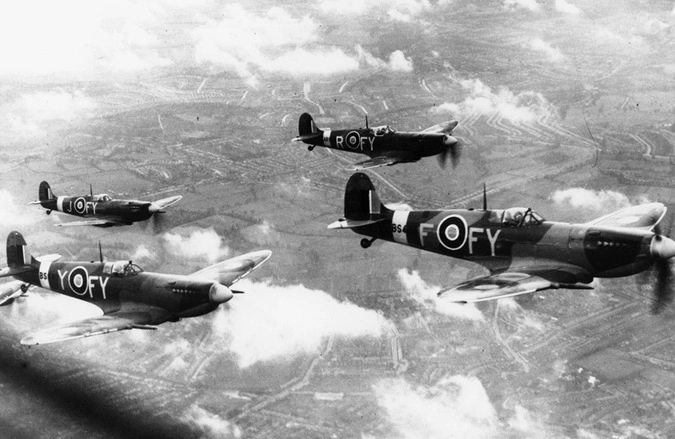 Британские истребители "Спитфайр" в полете над вражеской территорией во время Второй мировой войны. © AP Photo