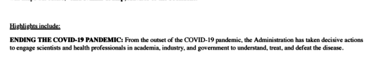 Научный отдел администрации президента США в преддверии выборов 2020 года выпустил пресс-релиз, посвященный «научным и техническим достижениям» на первом сроке президентства Дональда Трампа. В нем среди основных достижений действующей республиканской администрации названо и «окончание пандемии коронавируса».