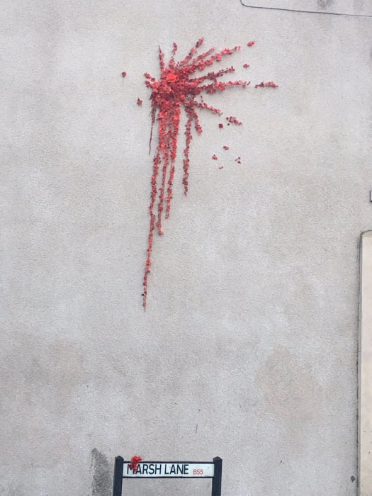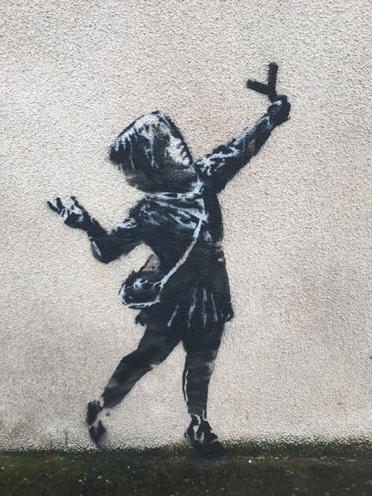Популярный британский уличный художник, известный миру под именем Бэнкси, возможно, сделал подарок на День святого Валентина жителям своего родного города Бристоль в западной Англии. На стене одного из домов появилась фреска, изображающая девочку с рогаткой, которая «выстрелила» брызгами красных цветов.