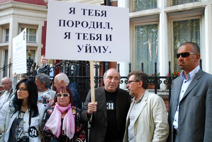 Борис Березовский (в центре) во время митинга в защиту 31-й статьи Конституции РФ перед зданием посольства России в Великобритании. © Елена Пахомова/РИА Новости