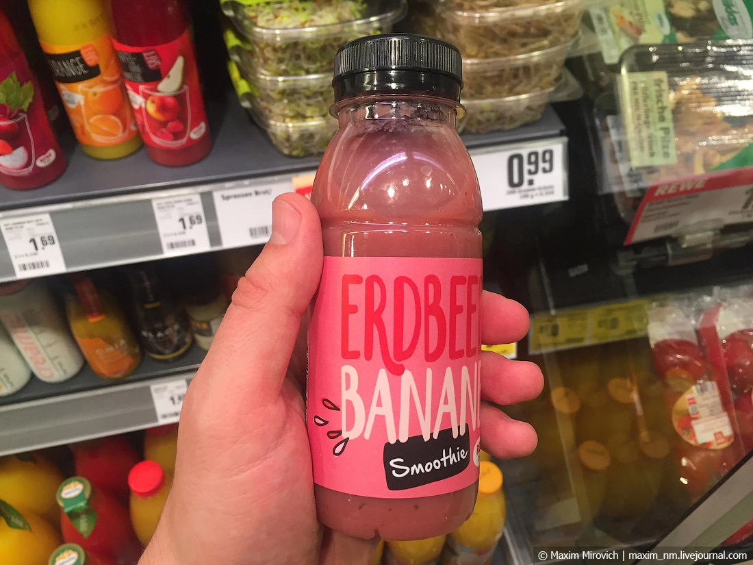 Ещё одна невероятно вкусная штука, которой не видел у нас в продаже — вот такой готовый смузи, бутылочка которого стоит меньше одного евро. Состав есть разный — ягоды/банан, киви/ананас/банан и так далее — очень классно в качестве перекуса во время прогулок по городу либо как легкий приём пищи на ночь. И да, оно продаётся ещё холодненькое, прямо из холодильника)