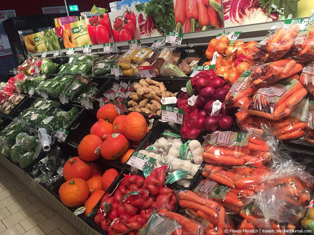 Входим в магазин. Первое, что бросается в глаза — внутри большой ассортимент овощей и фруктов, а также всего, что связано со здоровым питанием. Находятся эти ряды, как правило, в самом посещаемом месте в начале магазина — берете тележку/корзинку и сразу попадаете сюда.