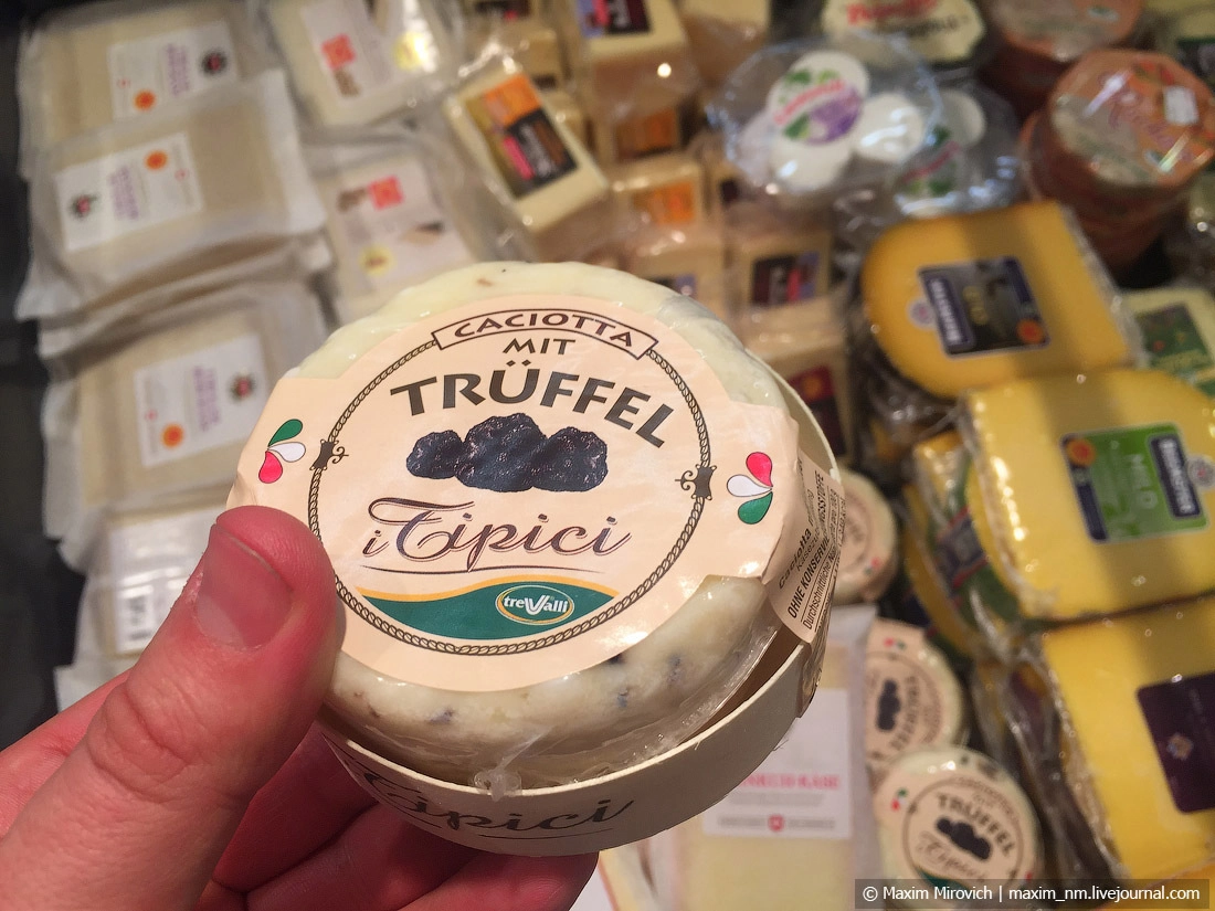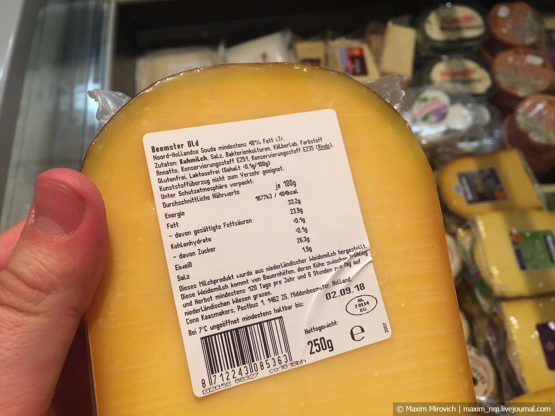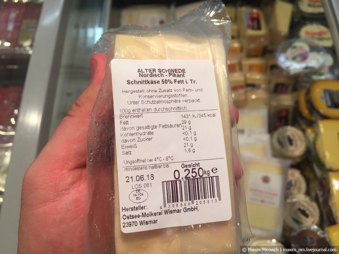 Сыр подешевле — аналог какого-нибудь нашего «Пошехонского». Сюда тоже никто не догадался плеснуть пальмового масла. Вот немцы дураки-то, да? Этож сколько сыра можно было из пальмового масла выжать.