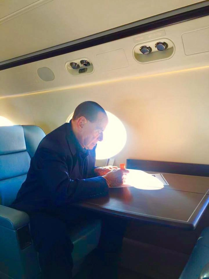 Этот пост Берлускони сопроводил фотографией, на которой он сидит в салоне самолета возле иллюминатора, склонившись над листом бумаги.