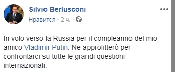 Бывший премьер-министр Италии Сильвио Берлускони вылетел на празднование дня рождения президента России Владимира Путина. Об этом итальянский политик сообщил на своей странице в Facebook.
