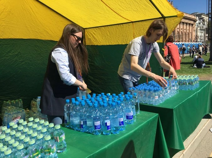 На Ленинградском проспекте всем участникам шествия бесплатно раздают воду.