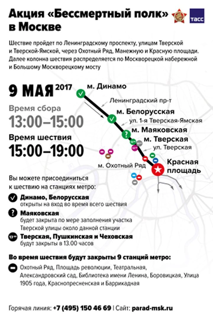 В Москве в шествии примут участие более 700 тысяч жителей и гостей столицы. Люди пройдут по Ленинградскому проспекту, улицам 1-й Тверской-Ямской и Тверской, через Охотный ряд, Манежную и Красную площади.