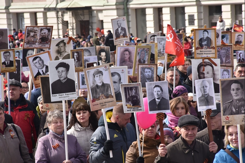 В Хабаровске около 60 тысяч человек пронесли фотографии участников Великой Отечественной под звуки песен военных лет в колонне, прошедшей по маршруту от площади имени Ленина до мемориального комплекса площади Славы.