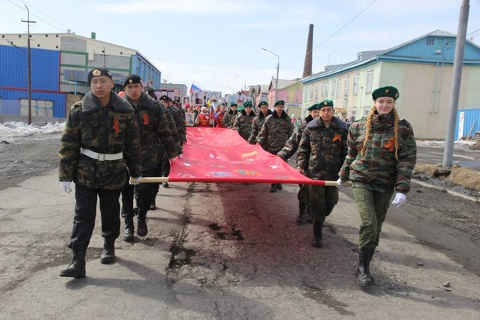 Холодная и ветреная погода Арктики не помешала поставить рекорд и в самом маленьком по численности жителей регионе Дальнего Востока — на Чукотке: с портретами участников Великой Отечественной войны на «Бессмертный полк» вышли две с половиной тысячи человек.