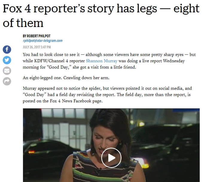 После эфира журналистка принялась коллекционировать сообщения прессы об этом «жутком событии» и даже выбрала лучший заголовок в СМИ: «У репортера Fox4 восемь ног».