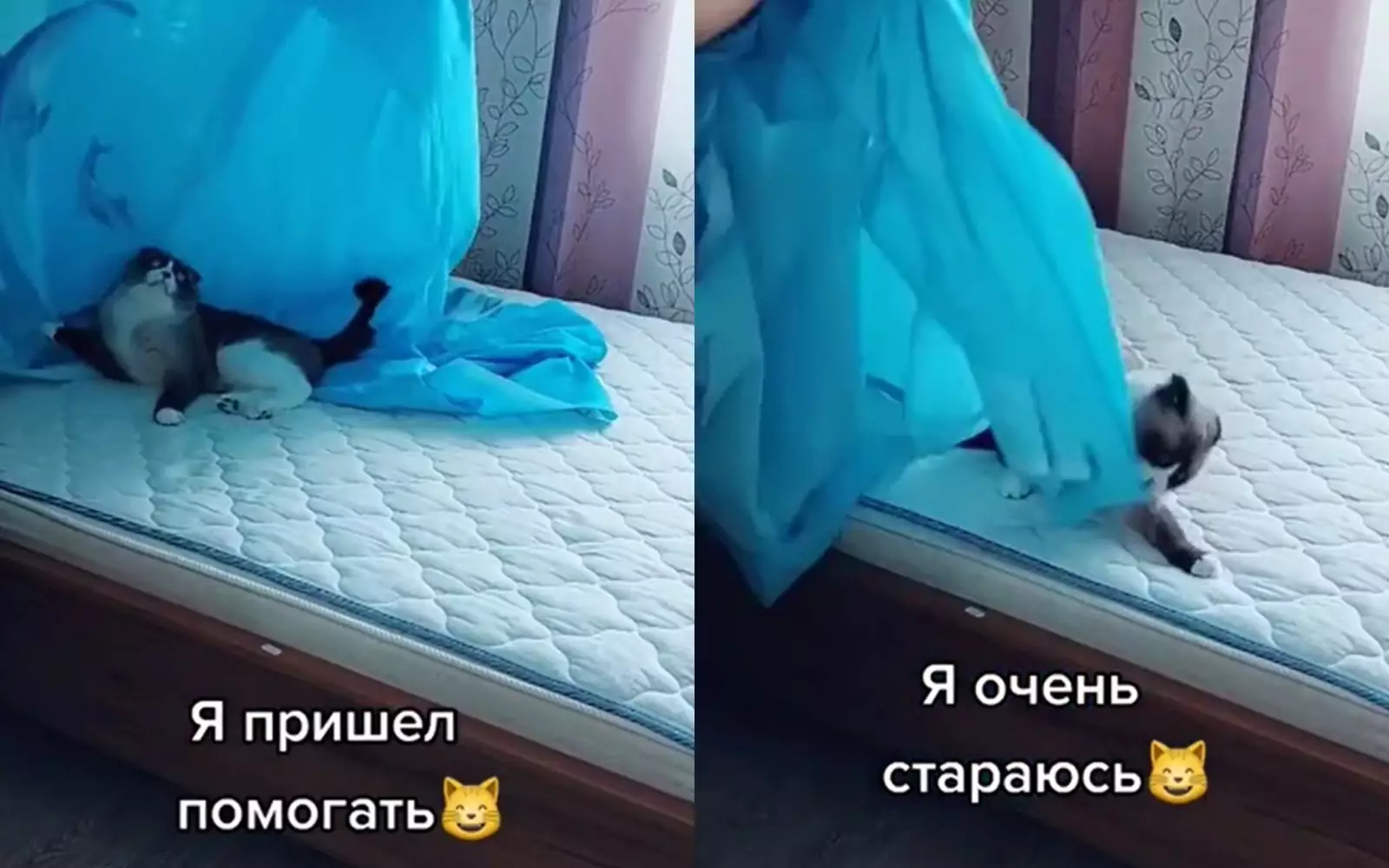 «Без меня нельзя»: кот решил помочь хозяйке заправить кровать