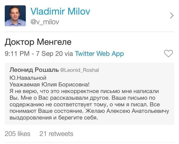 Сторонники блогера Алексея Навального продолжают интернет-травлю знаменитого детского хирурга Леонида Рошаля. Так, соратник Навального Владимир Милов назвал Рошаля «старой образиной» и «преступником», переодетым в белый халат. Еще он сравнил прославленного хирурга с нацистским врачом Йозефом Менгеле, который проводил над детьми бесчеловечные эксперименты.