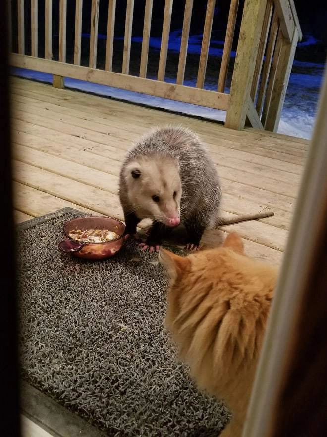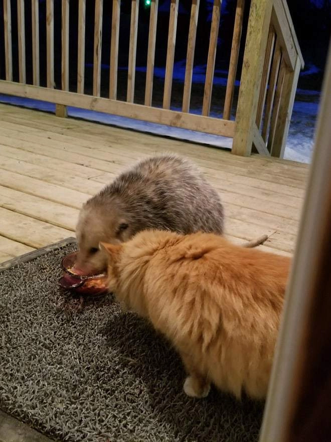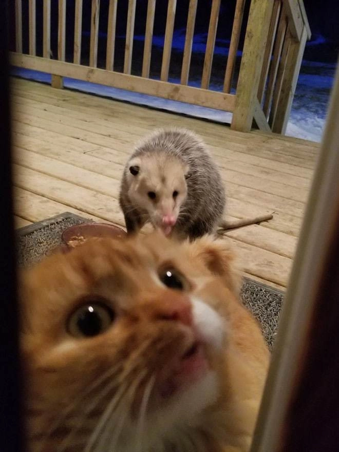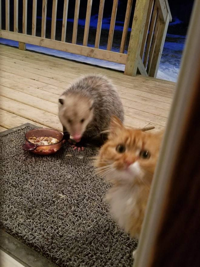 Никто бы не обрадовался, обнаружив незнакомца, который ест твою еду из твоей же тарелки. Пользователь фотохостинга Imgur с ником MrRogers247 опубликовал снимки своего котика, к которому в гости пожаловал наглый опоссум, чтобы полакомиться кошачьим ужином. Кот был настолько ошеломлён беспардонностью незваного гостя, что каждая фотография усатой мордочки говорит о его эмоциях красноречивее любых слов.