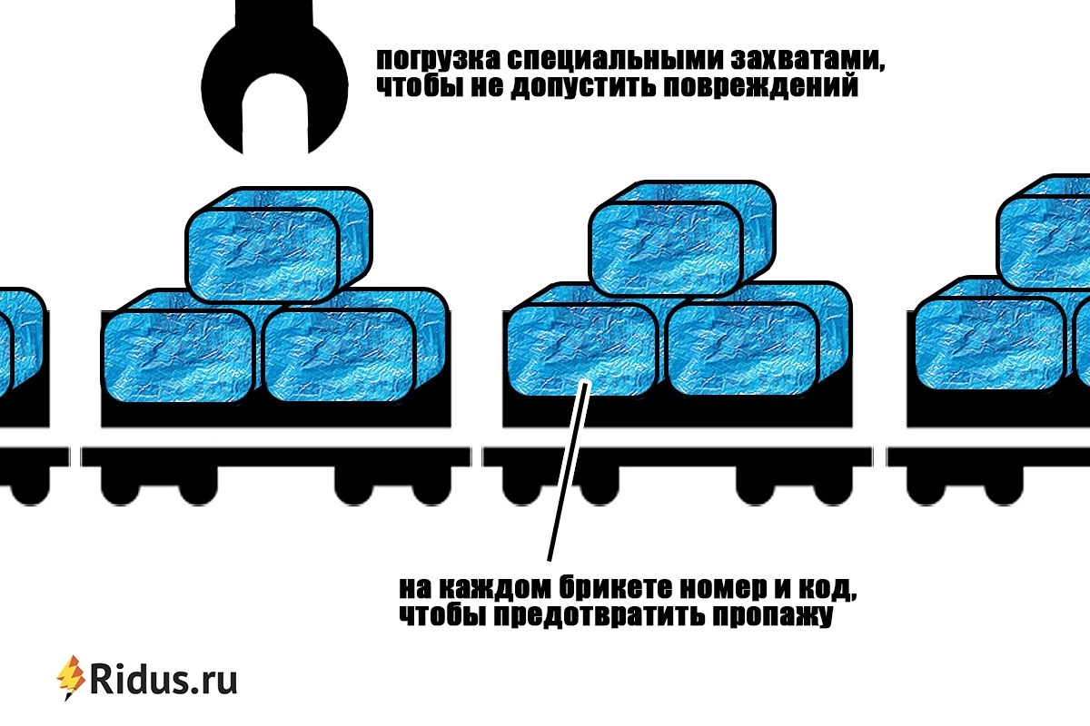 Мы уже говорили, что эргономичность упаковки гарантирует чистоту транспорта. Однако, несмотря на эту особенность, каждый вагон дополнительно оснастят специальным вкладышем, дабы уверенность в чистоте была стопроцентной. Также форма упаковки позволит уложить брикеты предельно плотно. Это позволит избежать перекатывания при движении и торможении, то есть нивелировать риск нарушения упаковки.