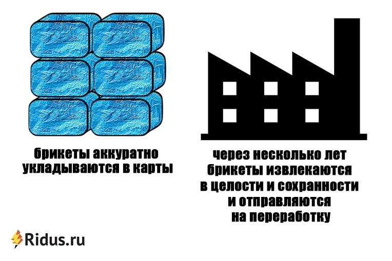 По прибытии в экотехнопарк брикеты с «хвостами» аккуратно поместят в карты, вымощенные надежным защитным экраном. Подробнее об устройстве таких карт читайте в одном из наших предыдущих материалов. Через несколько лет хранения брикеты можно извлечь в целости и сохранности и отправить на переработку.