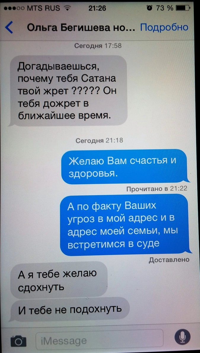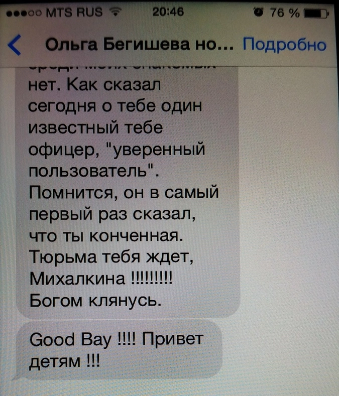 После этого телефон адвоката буквально расплавился от звонков и смс-ок. Михалкина узнала от Бегишевой о себе и своей карьере, всё что можно и нельзя. И — в основном в нецензурной форме. И это бы ладно. Но дальше посыпались угрозы. Причем, не только лично адвокату, но и ее детям…