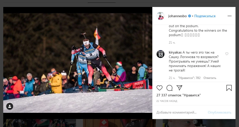 Российские поклонники биатлона, обиженные на критику в адрес Александра Логинова, используют других спортсменов в качестве «мусорной корзины», в которую можно «сбросить шлак». Так оценил множество негативных комментариев из России в своем Instagram норвежец Йоханнес Бё.