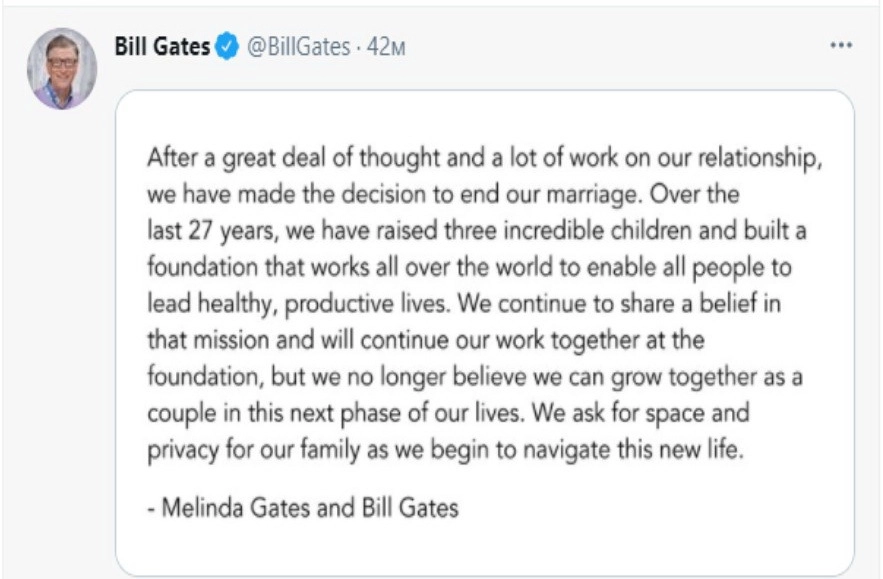 Корреспондент «Би-би-си» Ларри Мэдоуо отмечает с недоумением, что совсем недавно брал интервью у «Билла и Мелинды, и тогда они не говорили о разводе». Он назвал решение четы Гейтс «значительным».