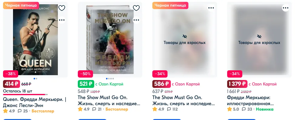 Обитатели соцсетей обнаружили, что маркетплейсы стали все чаще цензурировать обложки книг. К примеру, с недавнего времени OZON стал скрывать обложку биографии лидера Queen Фредди Меркьюри.