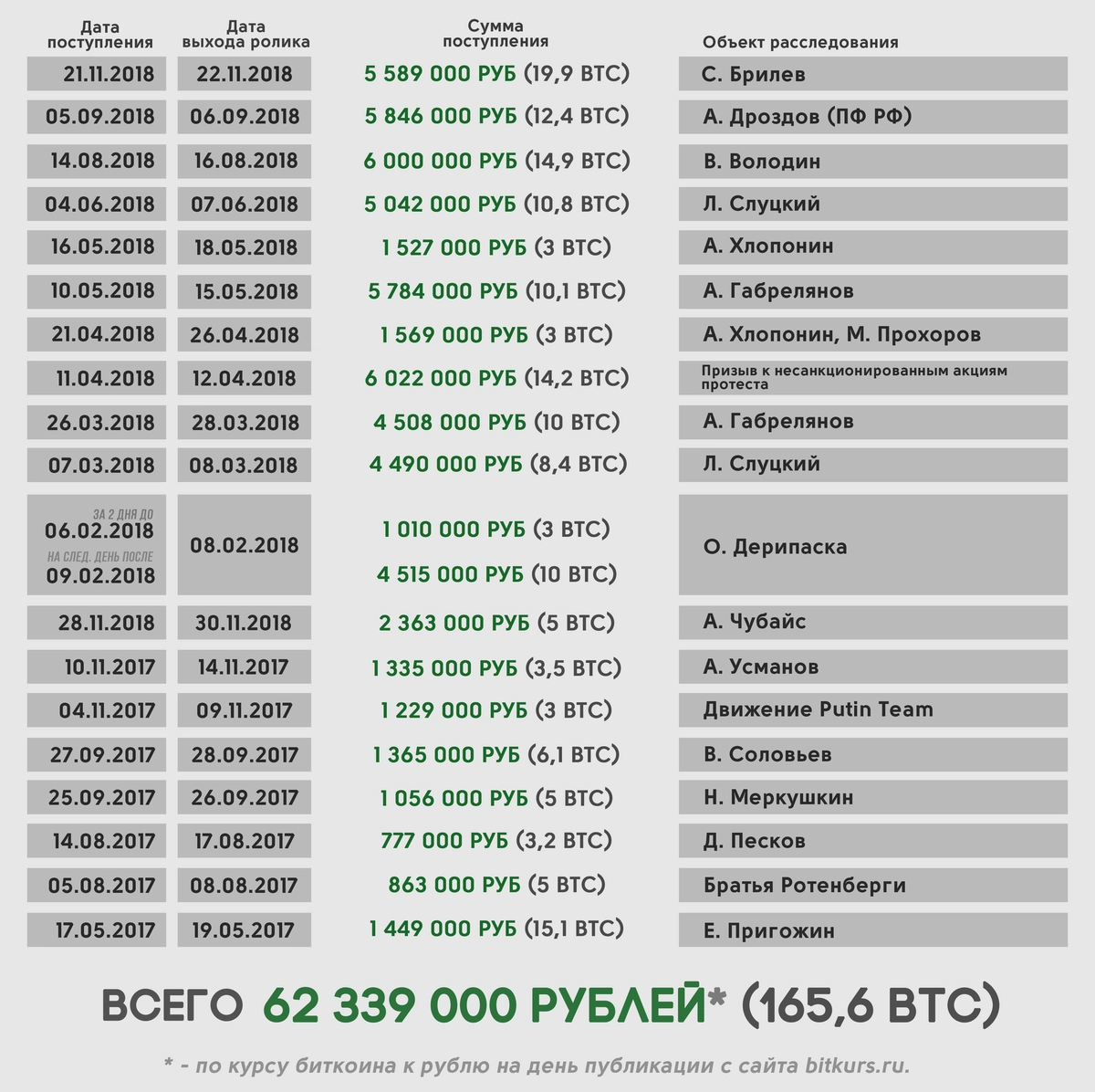 Ранее «Ридус» писал, что поступления миллионов рублей в виде биткоинов на счет Алексея Навального почти всегда совпадают с публикациями расследований в отношении высокопоставленных российских чиновников.