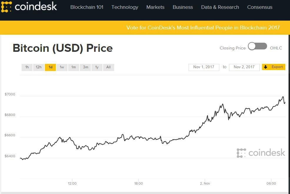 Курс криптовалюты биткоин в очередной раз обновил исторический максимум, установив новый ценовой рекорд. По данным профильных интернет-ресурсов Coindesk и Coinmarketcap, утром 2 ноября курс биткоина достиг отметки в 6992 доллара, однако в следующие несколько часов немного снизился, при этом общий восходящий тренд сохраняется.