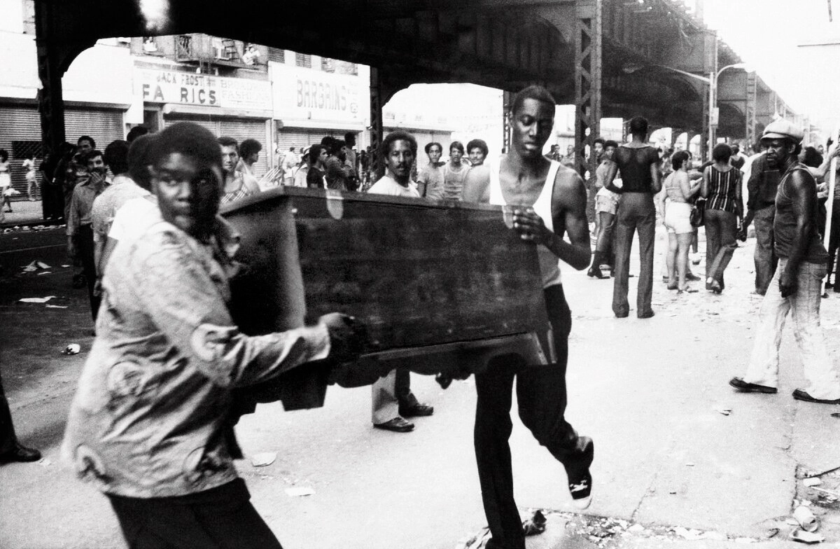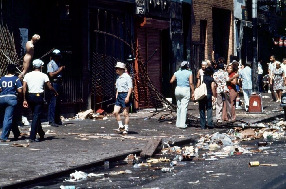 Во время аварии 1965 года на улицах царил дух отваги и взаимопомощи. Двенадцать лет спустя отключение электроэнергии [обитателями гетто] было воспринято как возможность экспроприировать имущество зажиточных горожан. В центральных кварталах Манхэттена началось беспрецедентно массовое мародёрство. Так описывает хронологию «Википедия».