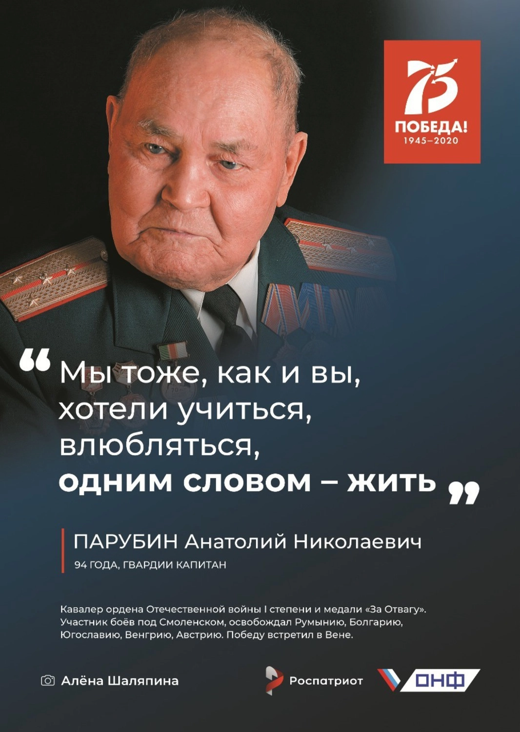 Анатолий Парубин ушел на войну в 16 лет. Свой первый бой он встретил за Смоленском. «Когда ты в бою, ты ни о чем не думаешь. Когда вышел из боя понимаешь: я остался жив. А мечта была одна — разгромить фашистов и заново отстроить свою страну», — вспоминает Анатолий Николаевич.
