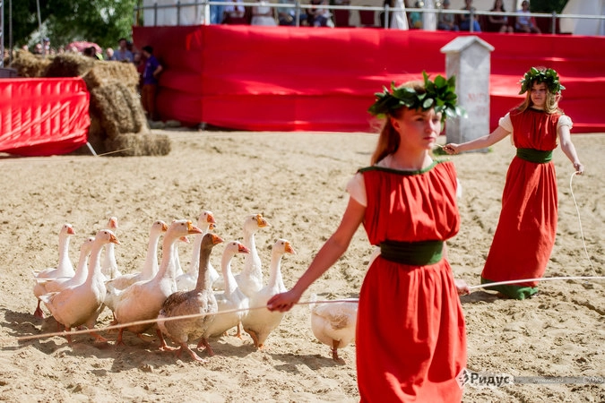 Открывалось событие появлением весталок на арене. Затем на площадку выводили гусей — птиц, которые по легенде спасли Рим, подняв гогот и предупредив тем самым спящий город о нашествии врага. В Коломенском одной из птиц так понравилось работать на публику, что вместо того, чтобы вернуться с остальными в загон, она улетела в толпу зрителей.