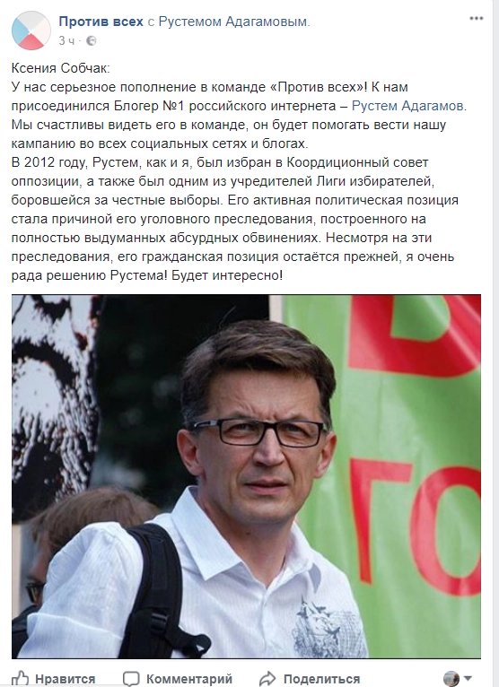 О пополнении в команде Собчак сообщила в своей группе в Facebook «Против всех». «К нам присоединился блогер № 1 российского интернета — Рустем Адагамов. Мы счастливы видеть его в команде, он будет помогать вести нашу кампанию во всех социальных сетях и блогах», — написала она.