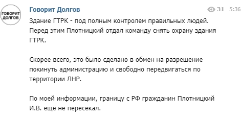 «Здание ГТРК — под полным контролем правильных людей. Перед этим Плотницкий отдал команду снять охрану здания ГТРК», — гаписал Долгов в своем телеграм-канале.