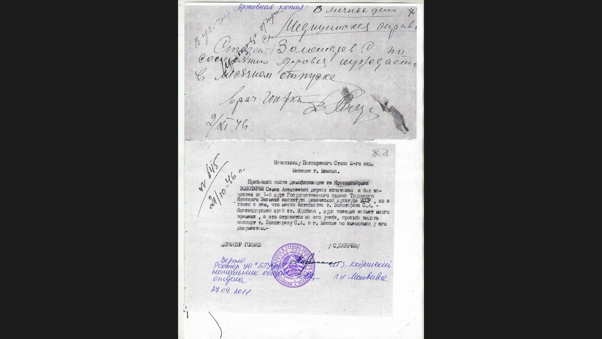 Даже паспорт он получает в Минске, уже по письменно просьбе ректора института. Якобы, Семёну далеко ехать и это скажется на его учебе. При этом сам Семён уже отпрашивался в родную станицу, так как писал ректору заявление и просил у того отпуск, до начала занятий, так как с 1941 года не видел свою семью. Странно, что в то время когда он был в станице паспорта он так и не получил, да и на учёт в военкомате тоже не стал. Или он не был дома, вообще?