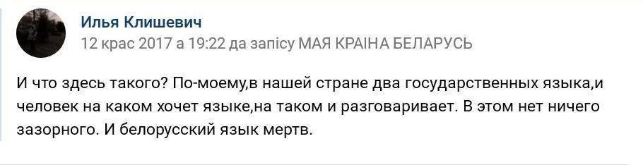 Житель Гомеля юрист, активист кампании «Делопроизводство по-белорусски», корреспондент блога «Мова Спартова» Игорь Случак пожаловался в прокуратуру на 16-летнего белорусского подростка Илью Клишевича, который пренебрежительно отозвался о государственном языке во время дискуссии в социальной сети «ВКонтакте».