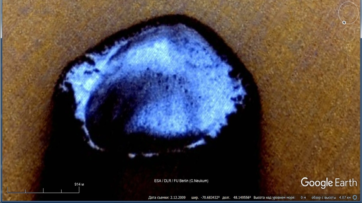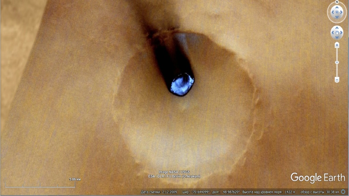 Пока, что объяснения у данного феномена нет. Фотография от 2009 года, координаты на сайте Google Earth (Марс): -70.669144°, 48.239188°. Если это кипящая, термальная вода, то все теории НАСА о Марсе ложные и ничего общего с истиной не имеют.