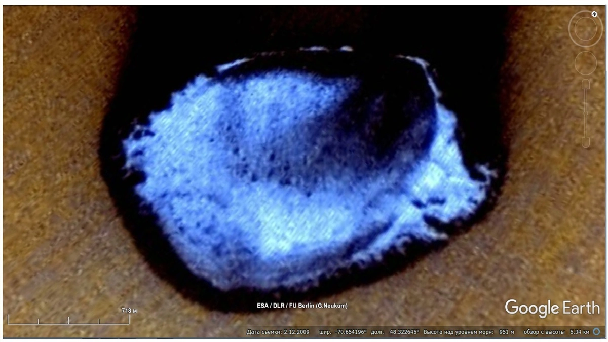 Но все не так просто. Скорее всего, это не вода, тем более в жидком состояние. Так как термальный источник выделяет пар, который там просто невозможен, так как атмосфера планеты сильно разряжена. Это застывший метан. Кстати, газовый карман был пробит небольшим метеоритом. Клубы газа мгновенно застыли в условия чрезвычайно низкой температуры.