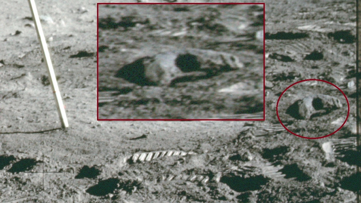 В месте высадки астронавтов на Луну, у них под ногами, лежит большой артефакт, очень похожий на череп гуманоидного типа. В космосе видны следы от стартующих и идущих на посадку ракет. В одном месте имеются сооружения, очень похожие, на огромного размера радарные антенны.