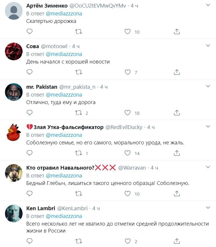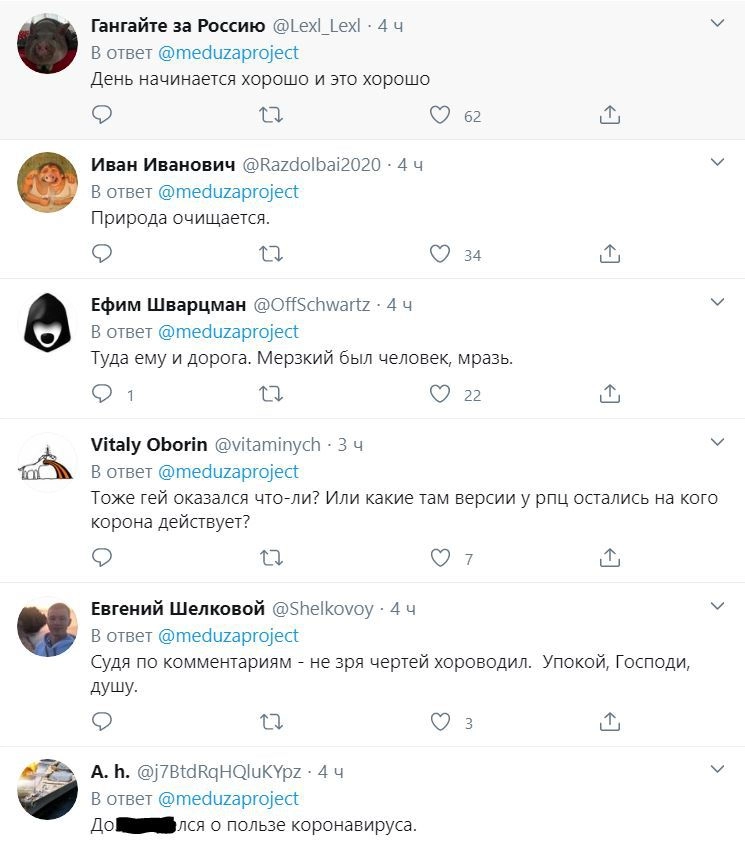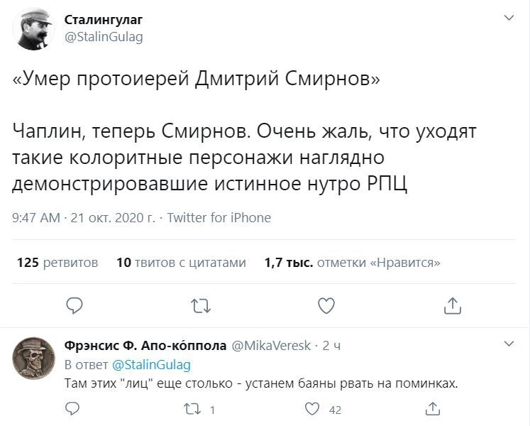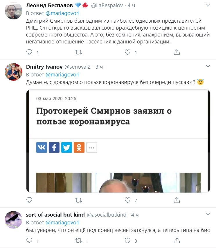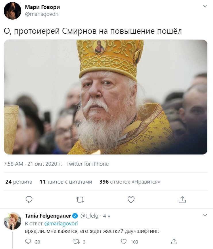 Среди злорадствующих оказались известные в России люди, в том числе журналистка Татьяна Фельгенгауэр. «О, протоиерей Смирнов на повышение пошел», — написала в Twitter YouTube-блогер Мари Говори. В ответ Фельгенгауэр заметила, что его скорее «ждет жесткий дауншифтинг».