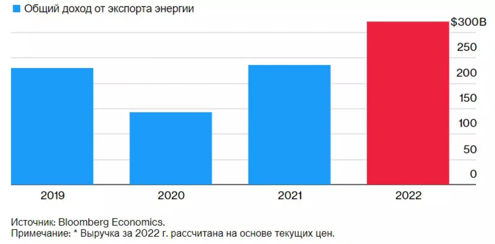 По расчетам Bloomberg Economics, несмотря на все трудности, выпавшие на долю потребителей внутри страны, и удушающее финансовое давление из-за рубежа, в этом году Россия заработает почти 321 миллиард долларов от экспорта энергоносителей, что более чем на треть выше, чем в 2021 году. Профицит счета текущих операций, по данным Института международных финансов (IIF), может достичь 240 миллиардов долларов.