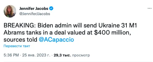 Ранее передать Украине танки Leopard-2 согласились власти Германии. Кроме того, Берлин разрешит поставлять Киеву немецкие танки другим странам Евросоюза.