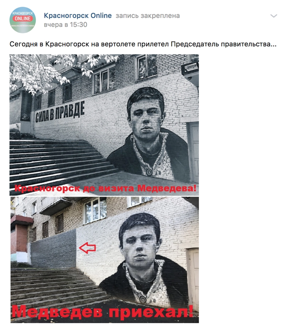 В Сети активно набирает обороты скандал связанный с приездом в подмосковный Красногорск председателя правительства Дмитрия Анатольевича Медведева, вчера он прилетал сюда на вертолете и к его приезду решили избавится от знаменитой в Красногорске граффити с изображением Сергей Бодрова младшего.