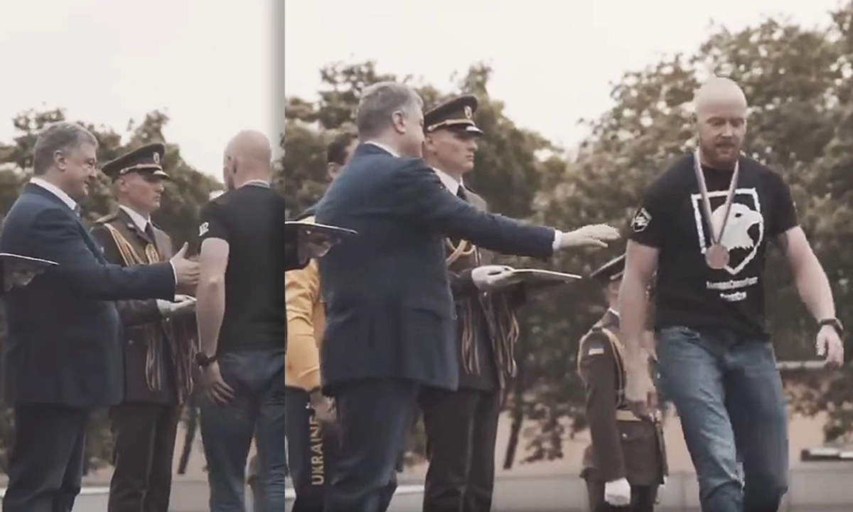 На ранее появившихся в Сети кадрах с церемонии награждения видно, как молодой человек принимает медаль от мужчины в одежде с символикой Украины, проходит мимо Порошенко и жмет руку человеку, стоящему за президентом. Не найдя отклика на свой дружественный жест, украинский лидер вдогонку хлопает бойца по плечу, не переставая улыбаться.