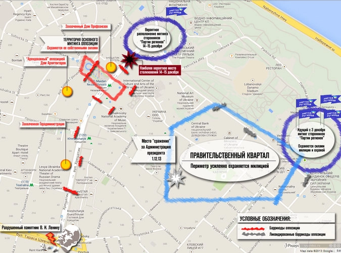 Предлагаю вашему вниманию карту центральной части Киева (кликните по ней для увеличения!). Обозначения в ней указывают места расположения основных сил оппозиции и, условно, сторонников действующей власти. На схему также нанесены бывшие и ныне существующие баррикады, место самого известного «сражения» (с использованием трактора), границы «правительственного» квартала, а также захваченные оппозиционерами здания.