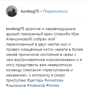 Прекрасный врач собрал мой переломанный в двух местах нос и привел смещенные кости черепа в более-менее приличное состояние, — написал режиссер в своем аккаунте в Instagram.
