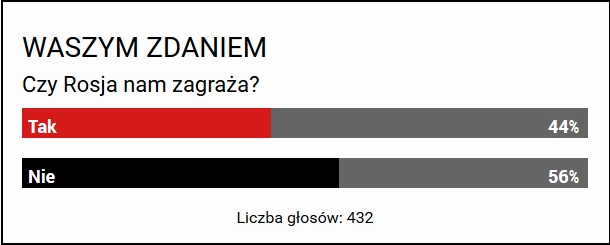 Стоит отметить, что ранее издание Fakt. pl в одной из своих статей проводило опрос по поводу российской угрозы. Читателям был задан вопрос «Угрожает ли нам Россия?». Ответы распределились следующим образом.