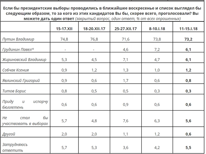 Как ранее писал «Ридус», социологи Всероссийского центра общественного мнения полагают, что действующему главе государства достанется около 73,2—76,8% голосов россиян на президентских выборах.