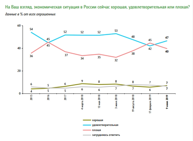 Что касается экономической ситуации в России, то здесь наблюдается рост некоторого оптимизма. Лишь 40% опрошенных говорят, что страна испытывает серьезные экономические трудности. В феврале 2019 года это мнение разделяли 45% респондентов.