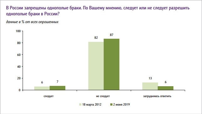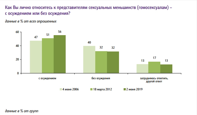 Так, 56% россиян полагают, что представители ЛГБТ-сообщества достойны осуждения. Более-менее лояльно к людям с нетрадиционной сексуальной ориентацией относятся 32%. Это на 8% меньше, чем в 2006 году.