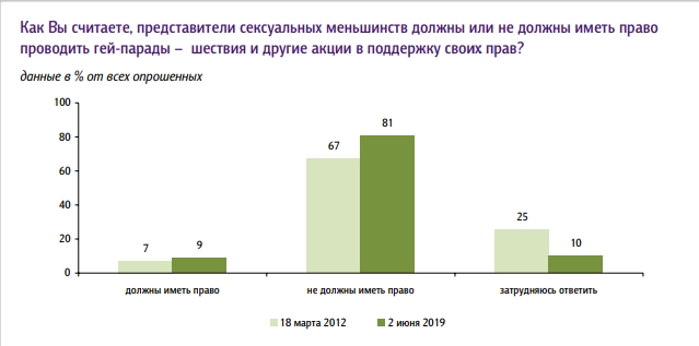 Похожая ситуация обстоит с гей-парадами: 81% россиян не хотят, чтобы представители ЛГБТ устраивали шествия в защиту своих прав. Противоположное мнение разделяют 9%, из них 4% выступают за предоставление геям и лесбиянкам права на усыновление детей.