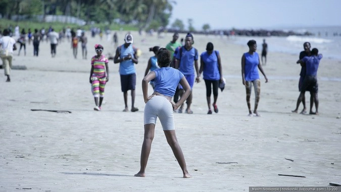 Большая перемена. Школьники из близлежащих учебных заведений выходят тусить на пляж. Пляж в Либревиле днем — фееричное место, где африканскому школьнику упасть негде.